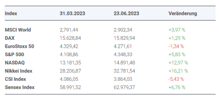 Die Geopolitik, die unverändert belastend auf die Weltwirtschaft wirkt, lieferte Richtung Ende des 2. Quartal 2023 Hoffnungswerte auf eine zukünftige Entspannung. Friedensinitiativen bezüglich des Ukraine-Konflikts gingen sowohl von China als auch von Afrika aus. Zwischen den USA und China kam es auf Außenministerebene in Peking zu einem angeblich konstruktiven Austausch, der fortgesetzt werden soll. Die deutsch- chinesischen Regierungskonsultationen waren konziliant im Ton. Verstärkte Kooperation in diversen Feldern wurde vereinbart. Die Entwicklungen sind zarte Sprösslinge, sie sind noch keine belastbaren Größen für die Realwirtschaft als auch Finanzmärkte.